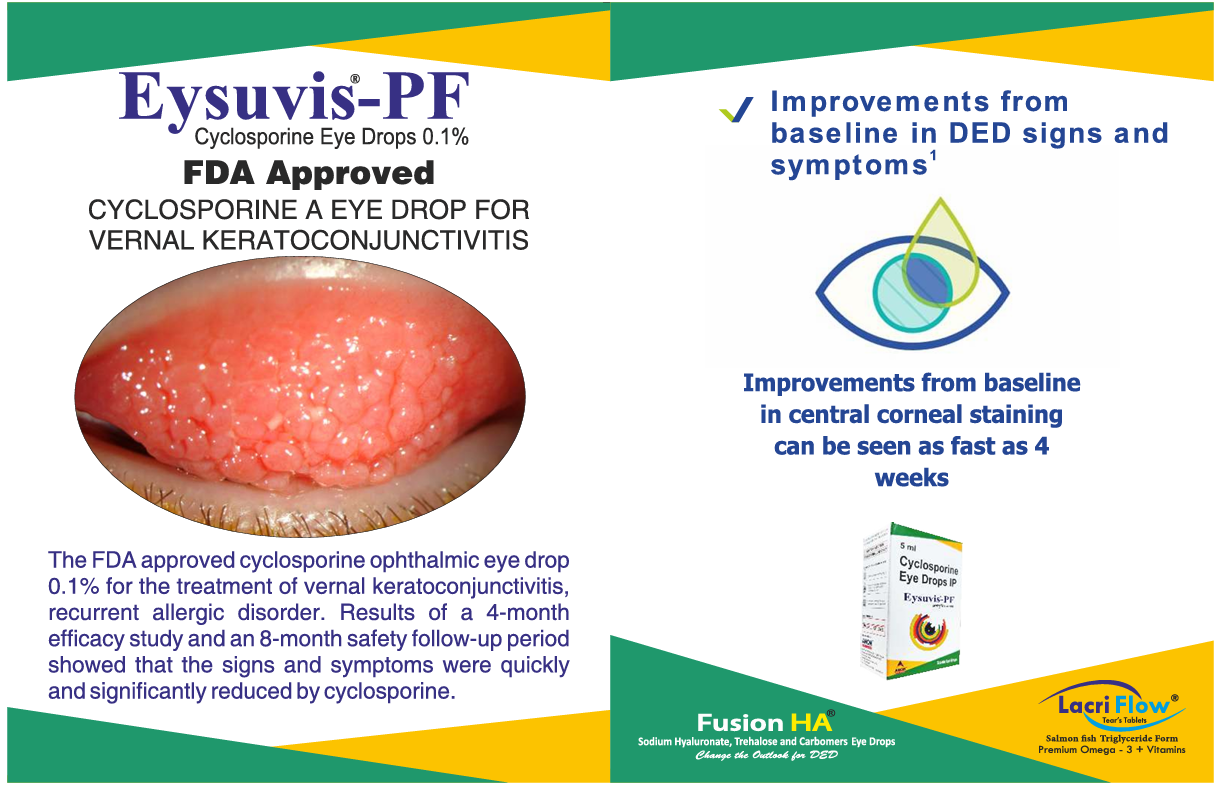 Eysuvis-PF® is an FDA-approved Cyclosporine A 0.1% ophthalmic solution indicated for the treatment of Vernal Keratoconjunctivitis (VKC) — a recurrent allergic inflammatory disorder of the ocular surface.
